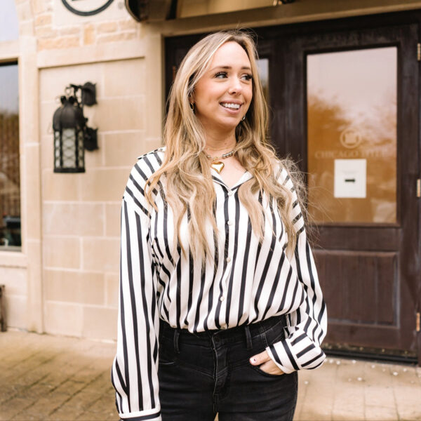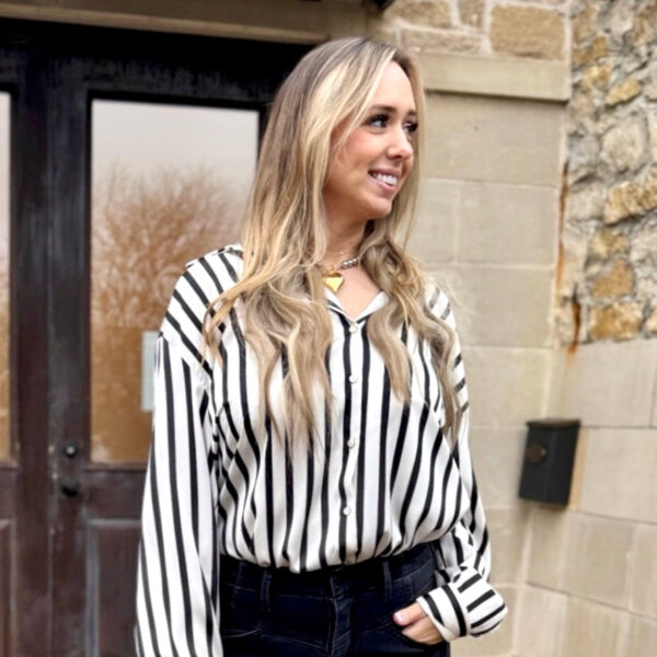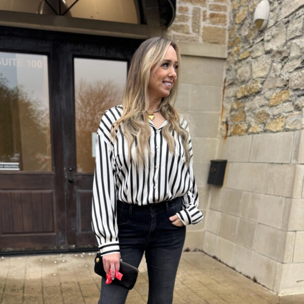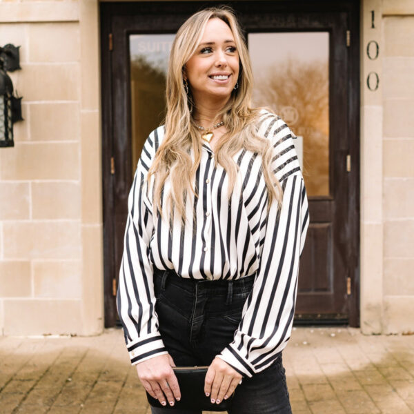 Our Damie Collard Vertical Striped Printed Satin Blouse offers a sleek, modern silhouette with its smooth satin fabric and striking striped pattern, perfect for adding a touch of elegance to your wardrobe!