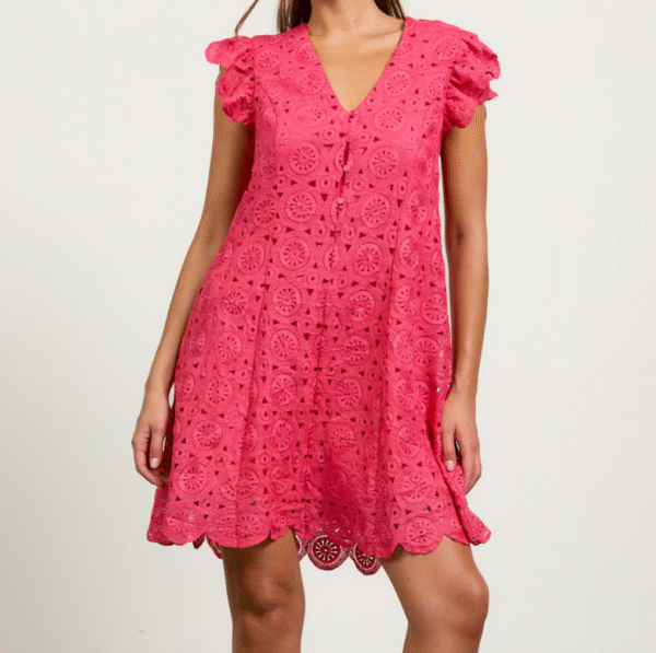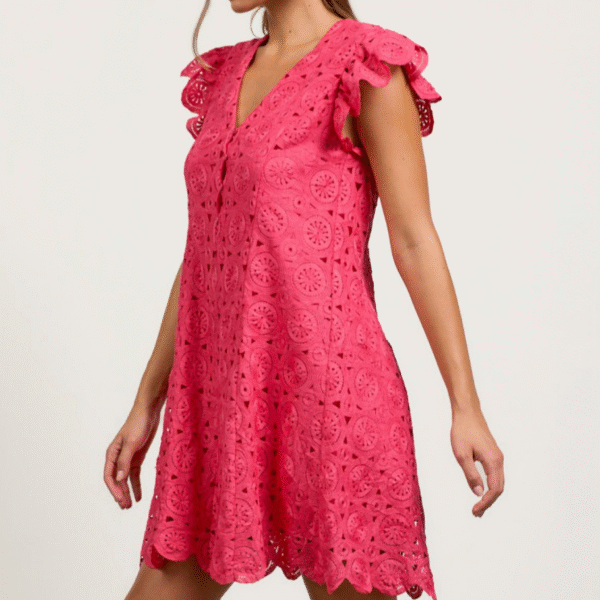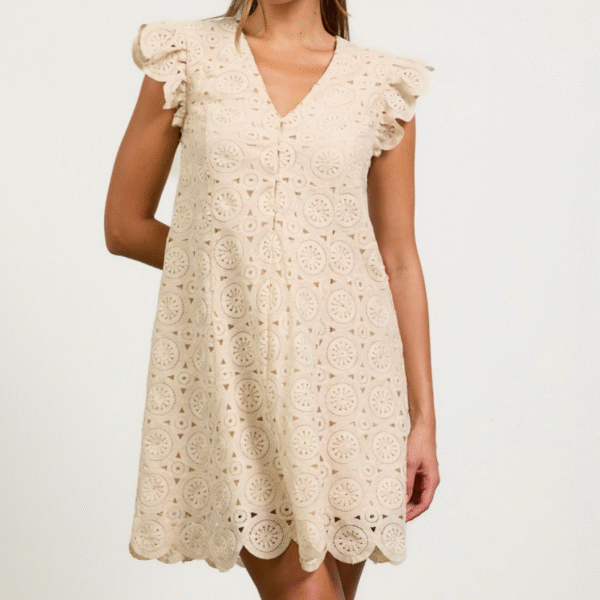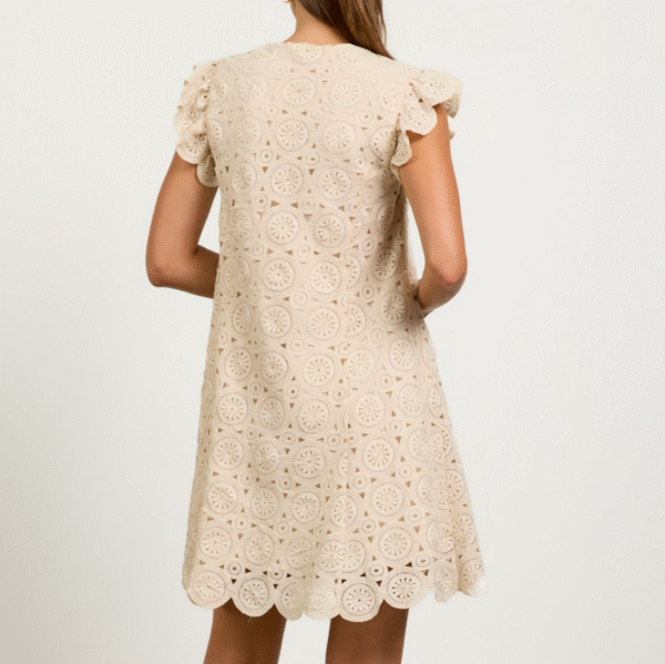 Our Sunset Bliss Crochet Mini Dress features intricate crochet detailing and a breezy, ruffle design, making it the perfect combination of laid-back boho style and sun-kissed elegance!
